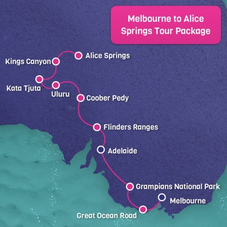 This Package includes a 3 day 2 night Great Ocean Road and Grampians tour from Melbourne to Adelaide and a 6 day 5 night Alice Springs to Adelaide tour.